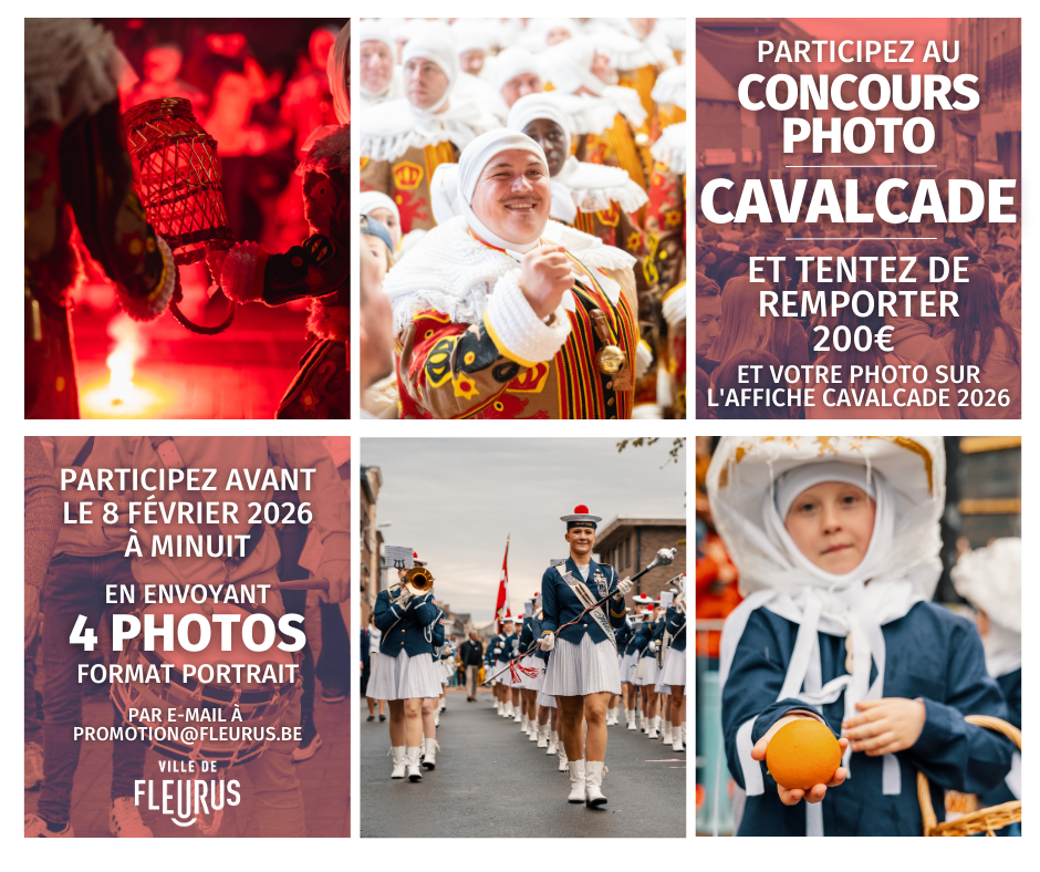 Le participant dont la photographie est sélectionnée pour l’affiche officielle de la Cavalcade 2026 accepte de céder à la Ville de Fleurus l’ensemble de ses droits d’auteur patrimoniaux. L’Organisateur se réserve le droit d’utiliser la photographie, en tout ou en partie, aux fins de mise en page, d’adaptation technique ou de communication, notamment par recadrage ou intégration d’éléments graphiques, dans le respect du droit moral de l’auteur et sans altération préjudiciable à l’intégrité de l’œuvre.