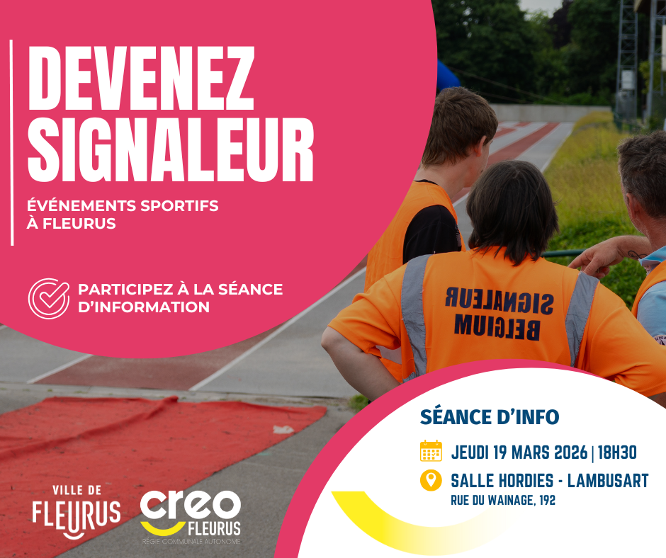 Si vous avez entre 16 et 77 ans et que vous désirez vous investir dans la vie locale, nous vous donnons rendez-vous à la séance d’information organisée par CREO Fleurus. Les signaleurs expérimentés sont également les bienvenus !