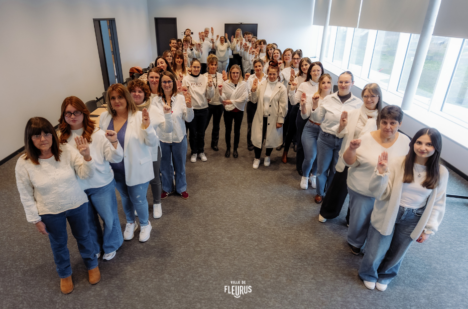 À l’occasion de la Journée internationale pour l’élimination des violences faites aux femmes, célébrée chaque 25 novembre, les agents communaux se sont réunis pour former un ruban blanc et réaliser le signe de la main, symboles universels de la lutte contre les violences faites aux femmes et les violences intrafamiliales.